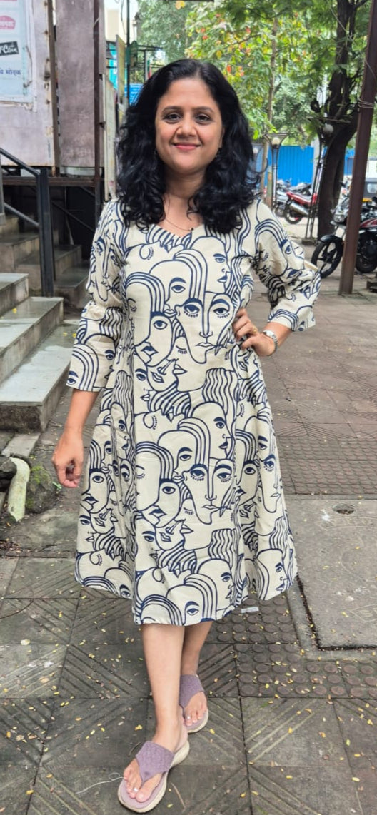 Fabric : Pure Cotton PrintedNeck Style : Pentagon Sleeves Style : 3/4 Sleeves with Bell Colour : Off WhiteAdditional Info : Soft, summer friendly fabric ,This dress has full pure cotton lining .Formal and casual look