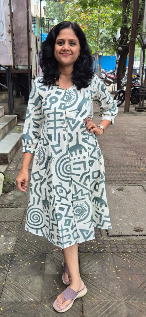 Fabric : Pure Cotton PrintedNeck Style : Rounded VSleeves Style : 3/4 Sleeves Colour : Off WhiteAdditional Info : Soft, summer friendly fabric ,This dress has full pure cotton lining .Formal and casual look