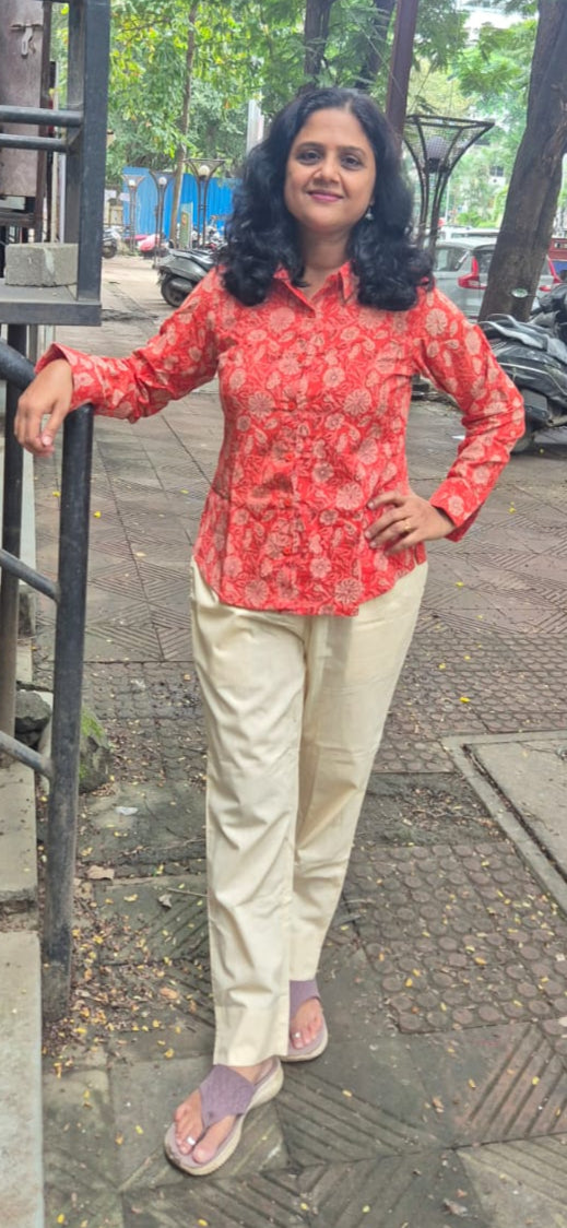 Fabric : Cotton DabuNeck Style :Shirt CollarSleeves Style : Full Sleeves with cuffColour : OrangeAdditional Info : Soft, summer friendly