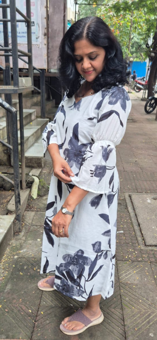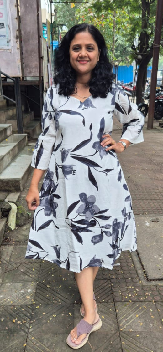 Fabric : Pure Cotton PrintedNeck Style : Pentagon Sleeves Style : 3/4 Sleeves with Bell Colour : WhiteAdditional Info : Soft, summer friendly fabric ,This dress has full pure cotton lining .Formal and casual look