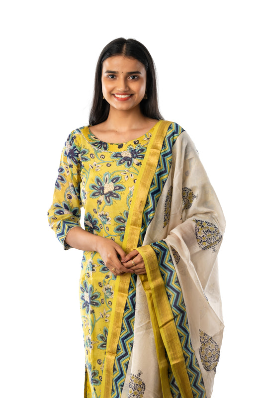Mehendi Green Block Printed Maheshwari Full Suit with Dupatta